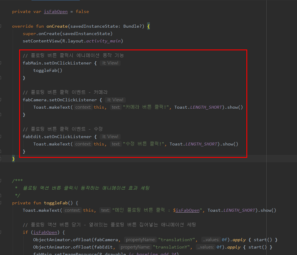 Toast.makeText(this, "메인 플로팅 버튼 클릭 : $isFabOpen", Toast.LENGTH_SHORT).show()