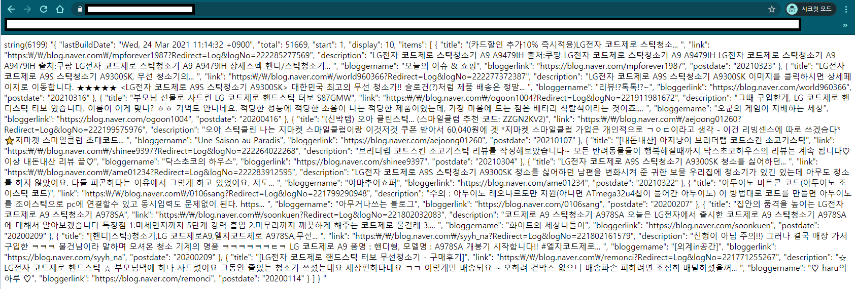 $url = "https://openapi.naver.com/v1/search/blog.json?query=".$encText; // json 결과