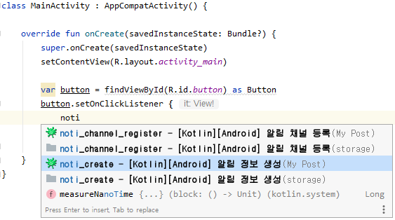 '알림 채널 등록' 이벤트를 누를 경우 코드가 자동으로 완성이 됩니다.
