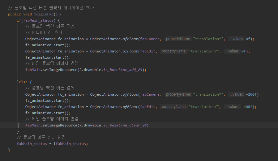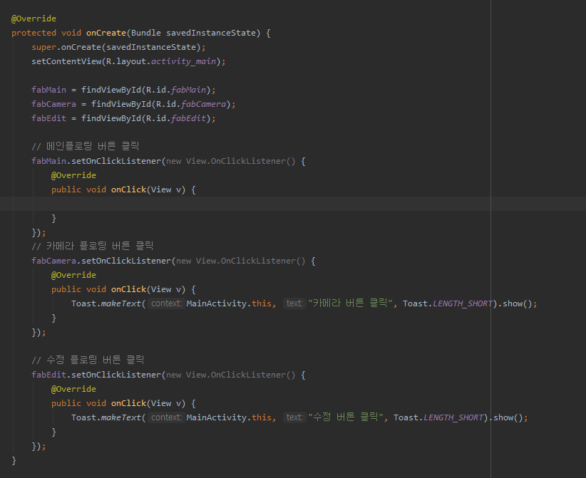 toggleFab()을 메인플로팅 버튼 클릭 리스너에 넣어서 마무리를 합니다.