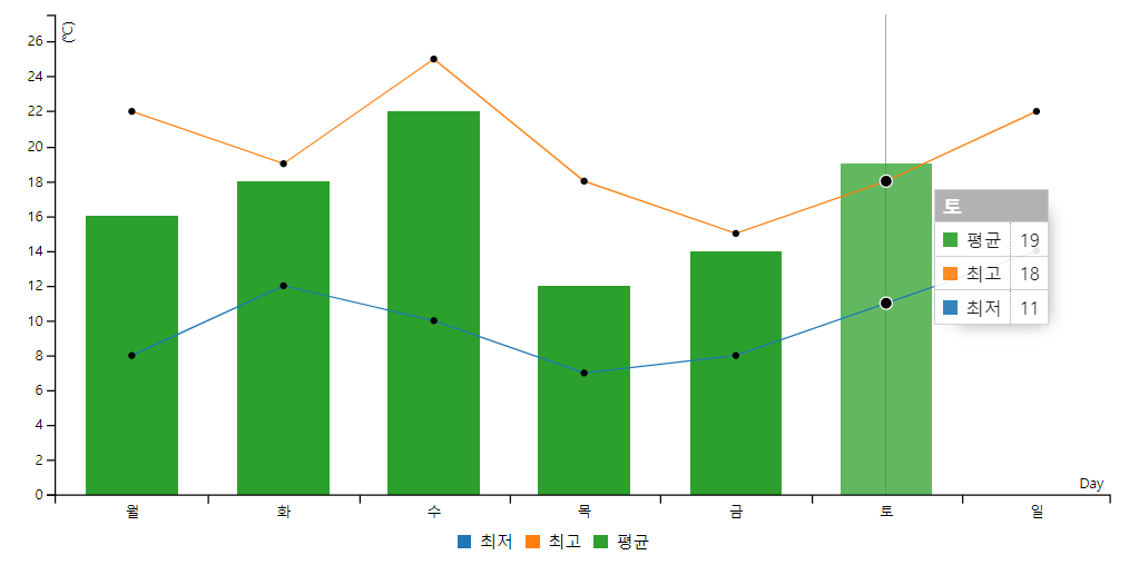 위의 예제에서는 평균 기온을 추가한 뒤 평균 기온의 경우 bar 형태로 표시되게 처리하였습니다. 위 코드에서 보다시피 data의 types 에서 원하는 모양의 차트를 설정해 줄 수 있습니다.