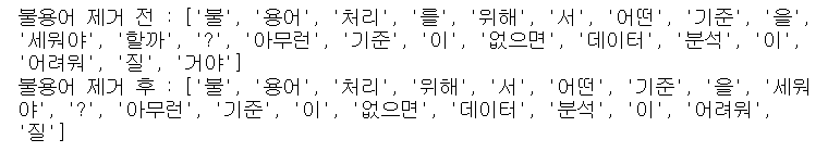 example = "불용어 처리를 위해서 어떤 기준을 세워야 할까? 아무런 기준이 없으면 데이터 분석이 어려워 질 거야"