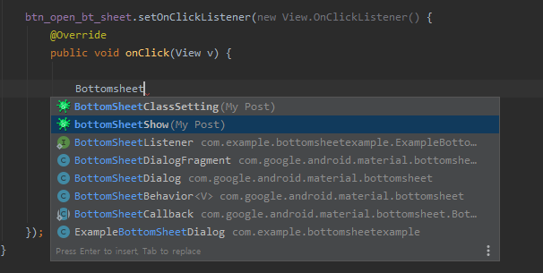 이것들을 한번에 설정해주는 스틱코드를 사용하여 빠르게 ExampleBottomSheetDialog를 셋팅해보도록하겠습니다.