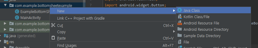 그리고 다음과 같이 바텀시트 다이얼로그 프래그먼트를 클래스 파일로 만들어줍니다.