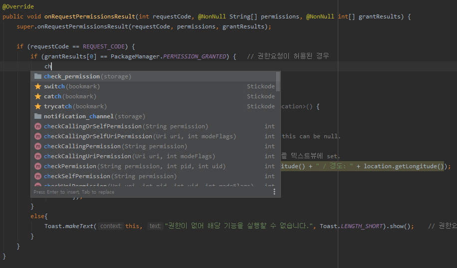 저는 스틱코드를 이용하여 권한요청 코드를 빠르게 불러왔습니다.